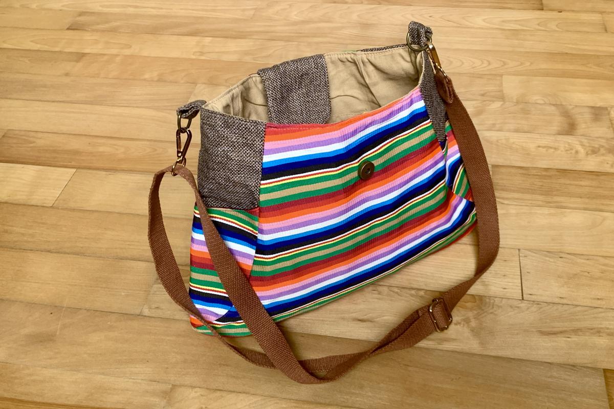 Long adjustable canvas strap for shoulder or cross body wear. Magnetic snap closure. Two exterior outside pockets. One large interior pocket. 40cm x 30cm