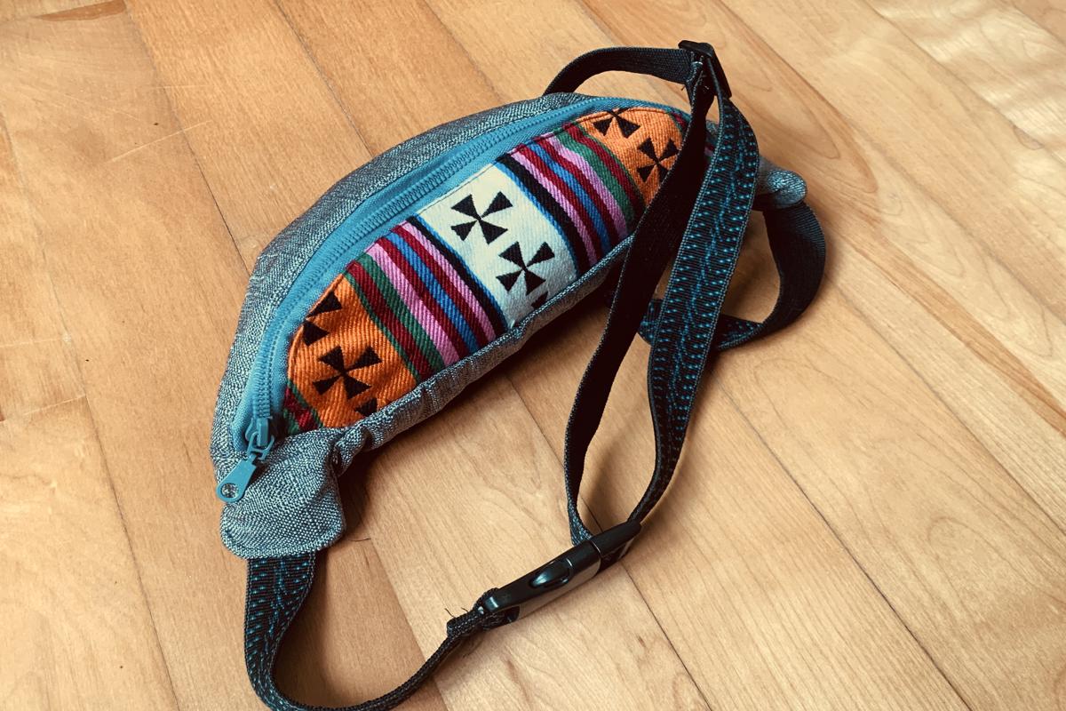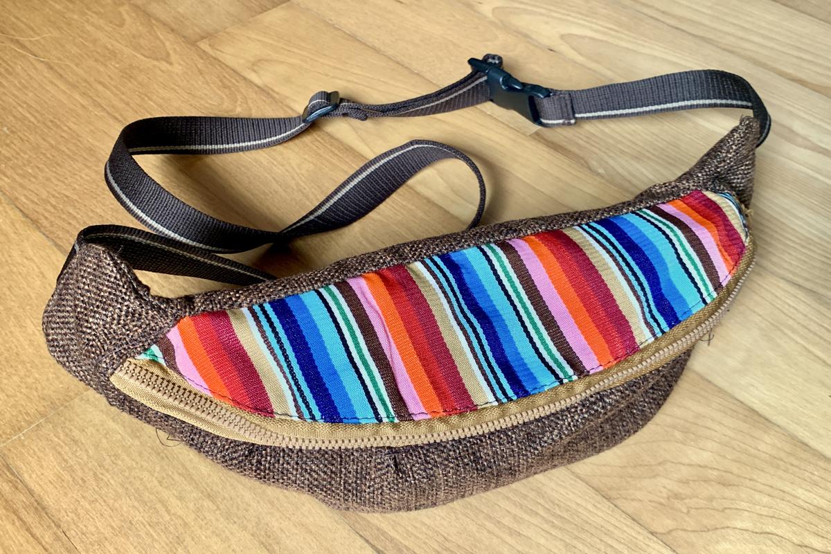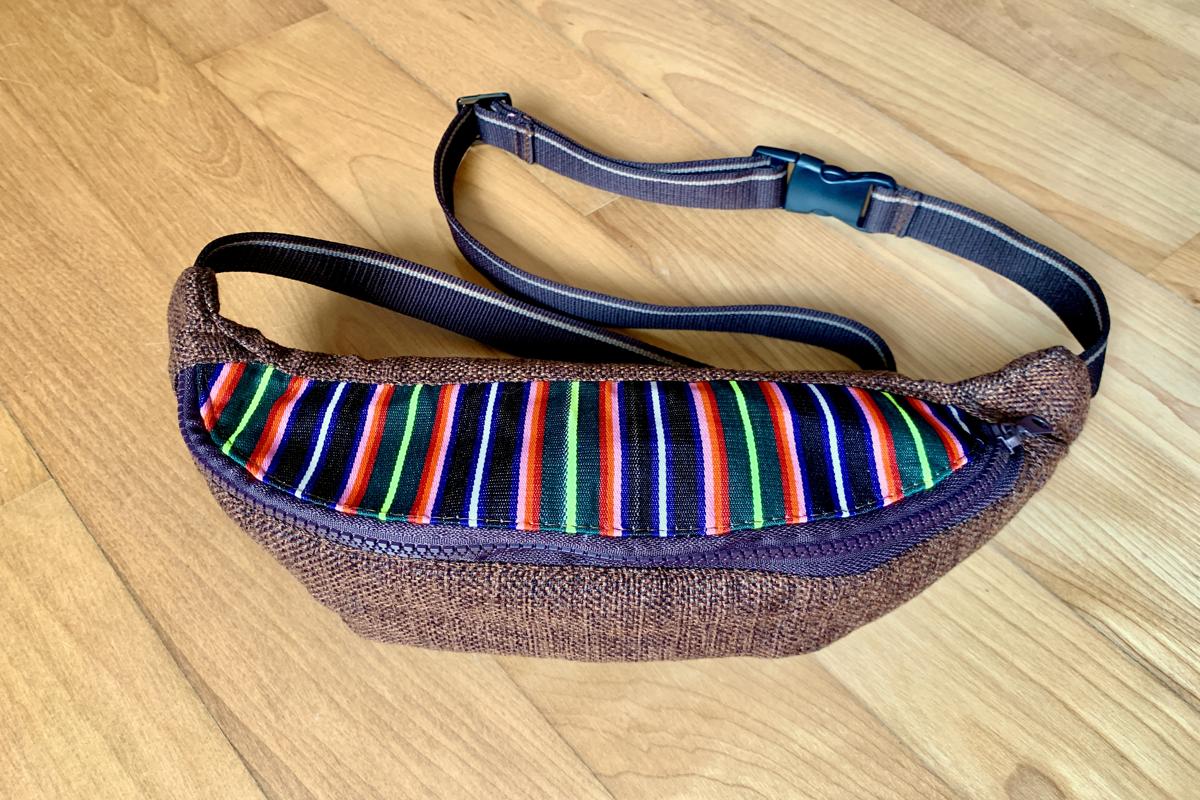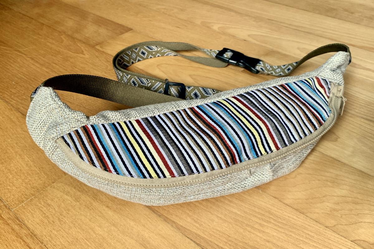 Unisex fanny sling bag. Made with bright ethnic fabric and contrasting neutral hemp. Long adjustable canvas strap. 34cm x 14cm