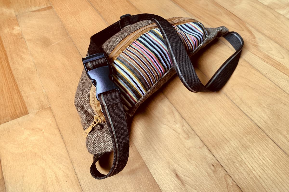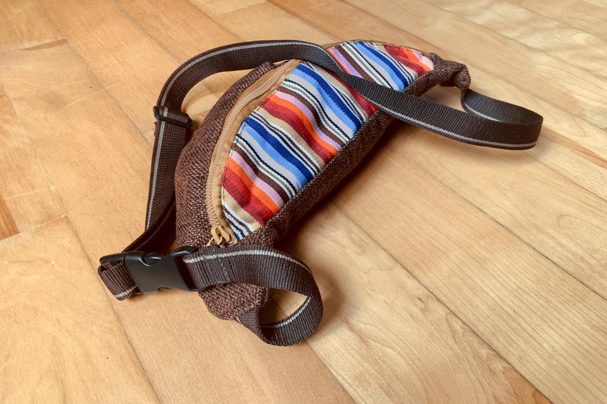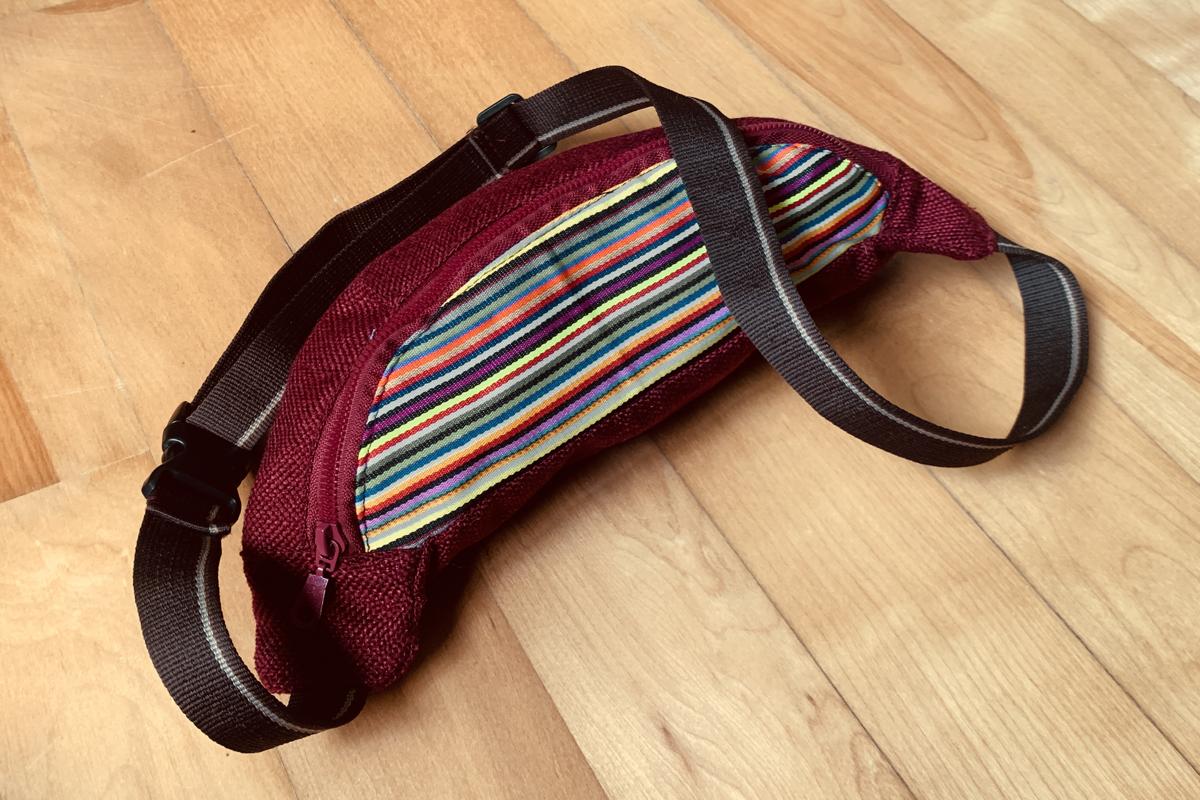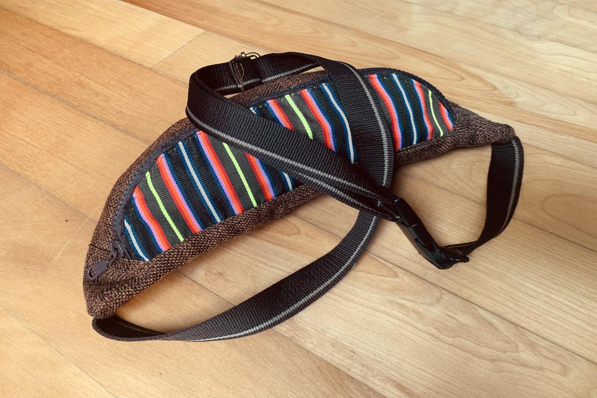 Unisex fanny sling bag. Made with bright ethnic fabric and contrasting neutral hemp. Long adjustable canvas strap. 34cm x 14cm